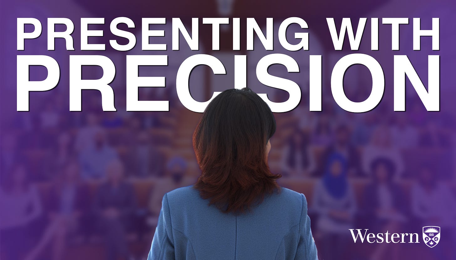 Presenting with Precision is a workshop about maximizing the impact of your next presentation, keynote, or lecture. Learn how to optimize your delivery, presentation structure, and slide design. Explore the fundamentals of messaging, audience connection, narrative and storytelling, stage presence, and how your listeners interpret and learn from presentations.